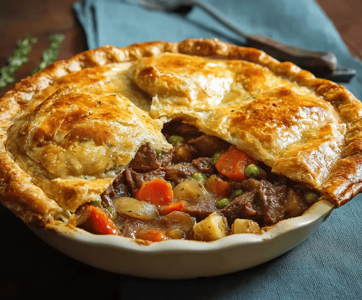 Delicious homemade beef pot pie topped with golden flaky crust and served in a rustic bowl, showcasing tender beef and vegetables in a savory gravy