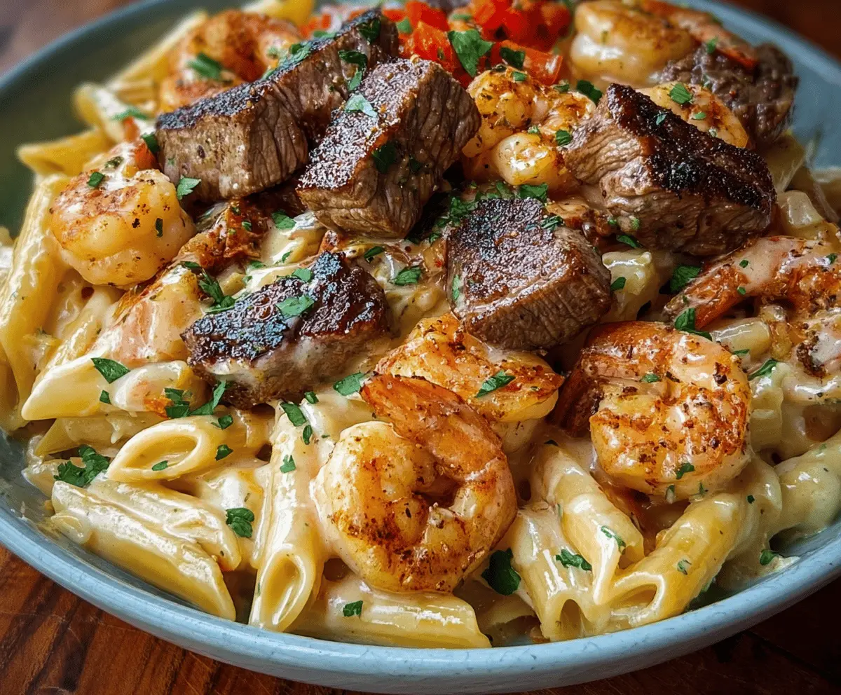 Add the cooked pasta to the Alfredo sauce and toss well to coat every bite. Plate the creamy pasta, then top it with the Cajun shrimp and seared steak cubes. Sprinkle freshly chopped parsley over the top for a fresh touch. Serve immediately and enjoy!