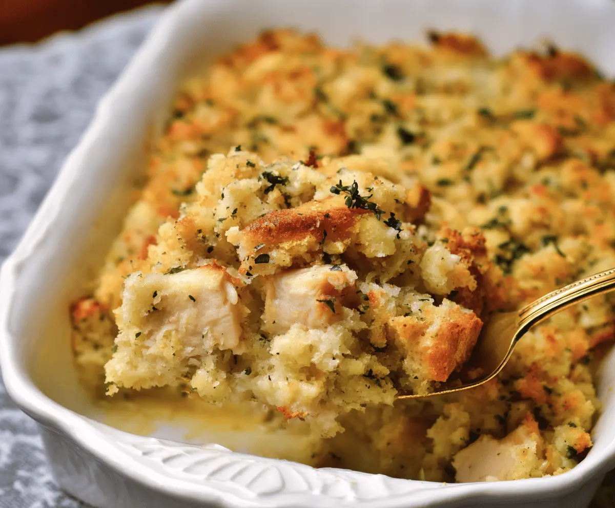Delicious Chicken and Stuffing Bake with golden-brown topping, served on a plate with fresh herbs