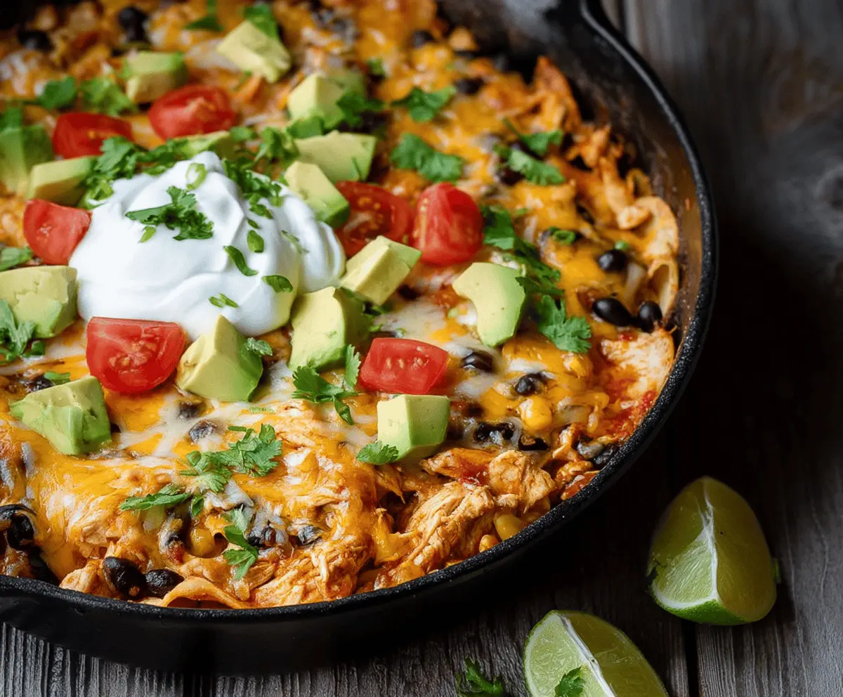 Chicken Black Bean Enchilada Skillet is a one-pan meal packed with tender chicken, hearty black beans, and melty cheese, all mingling with classic enchilada flavors. The combination of spices, salsa, and a little bit of gooey cheese on top makes this dish both colorful and comforting.