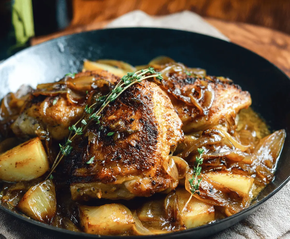 I love making this recipe on a cool evening when I want something comforting but not too heavy. The slow braise means the chicken comes out melt-in-your-mouth juicy, and those golden-brown onions are my favorite part—they bring a natural sweetness that perfectly balances the cider’s tartness. I usually stir the onions around a bit to make sure they don’t burn and cook the chicken just until it’s falling apart tender.