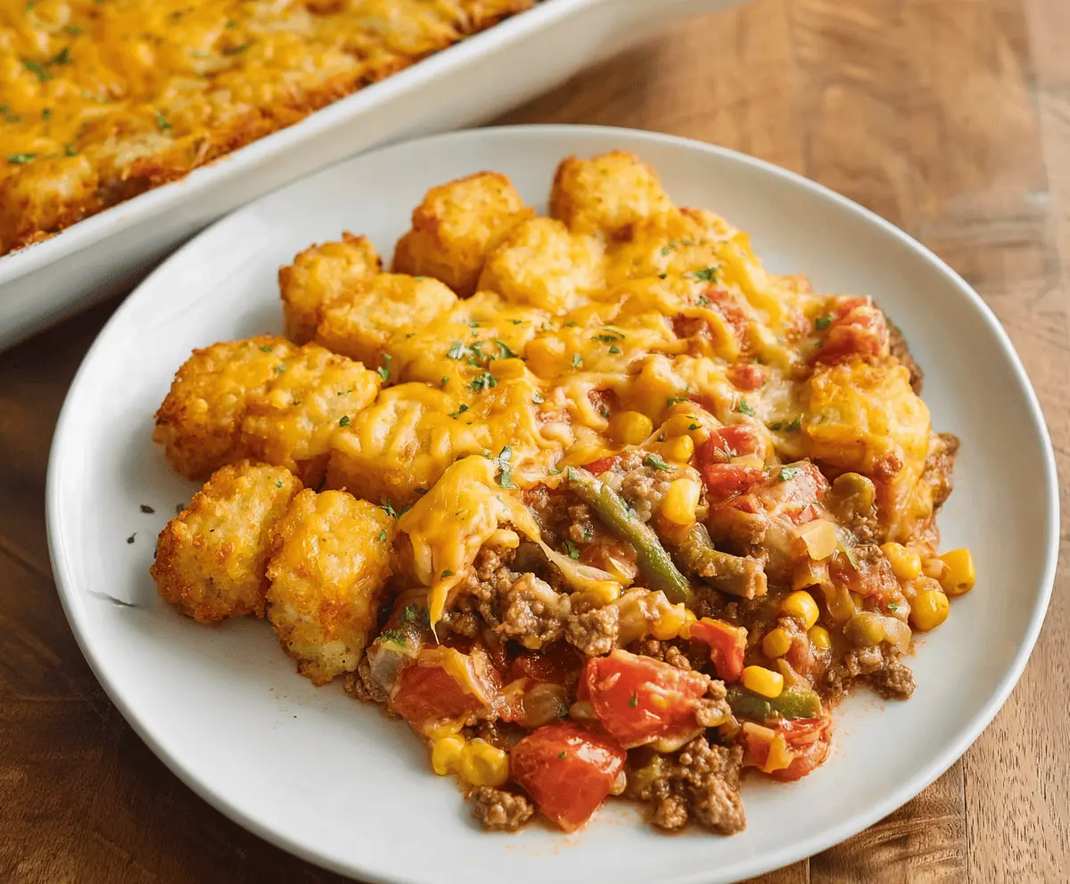 Pour the beef mixture evenly into a greased 9×13-inch casserole dish. Sprinkle shredded cheddar cheese on top of the beef layer. Then arrange the frozen tater tots in a single layer over the cheese for a crispy, golden topping.