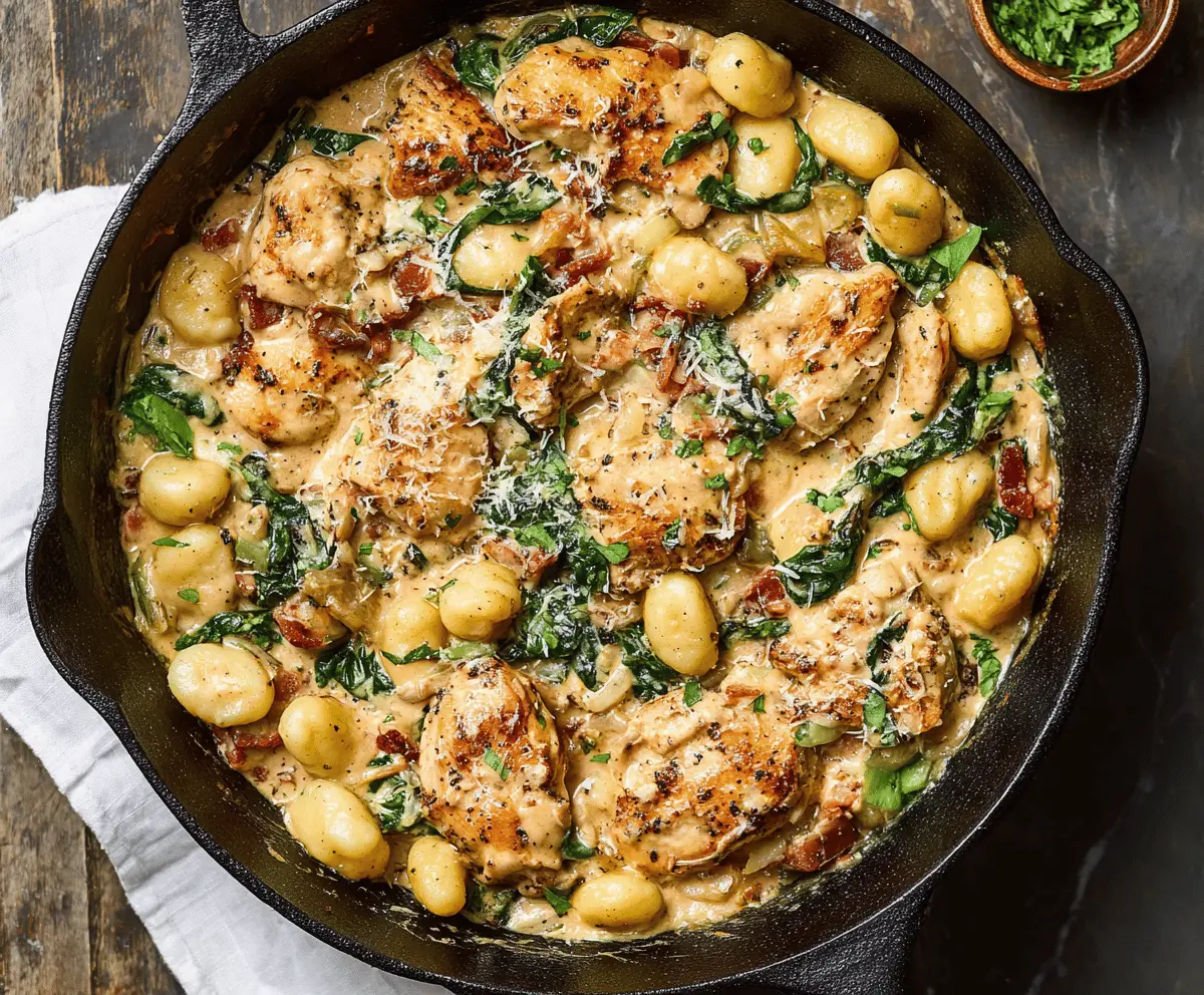 Put the chicken back into the skillet, nestling it into the creamy gnocchi and spinach mixture. Let everything warm through for a couple of minutes. If you like, cook the bacon in a separate pan until crispy, drain it on paper towels, and sprinkle it on top. Finish by adding green onions and crushed red pepper flakes if you want a little extra kick. Serve right away and enjoy!