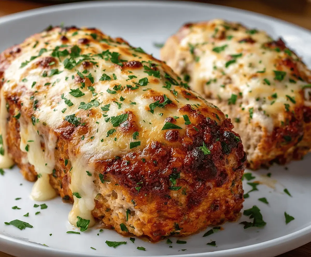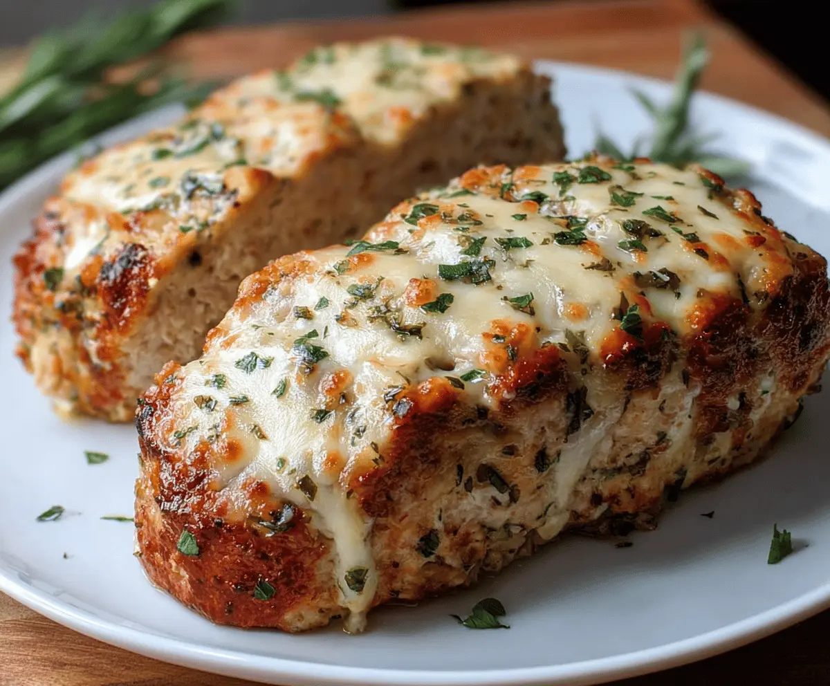 Juicy Garlic Parmesan Chicken Meatloaf topped with melted cheese and fresh herbs on a white plate, served with sides.
