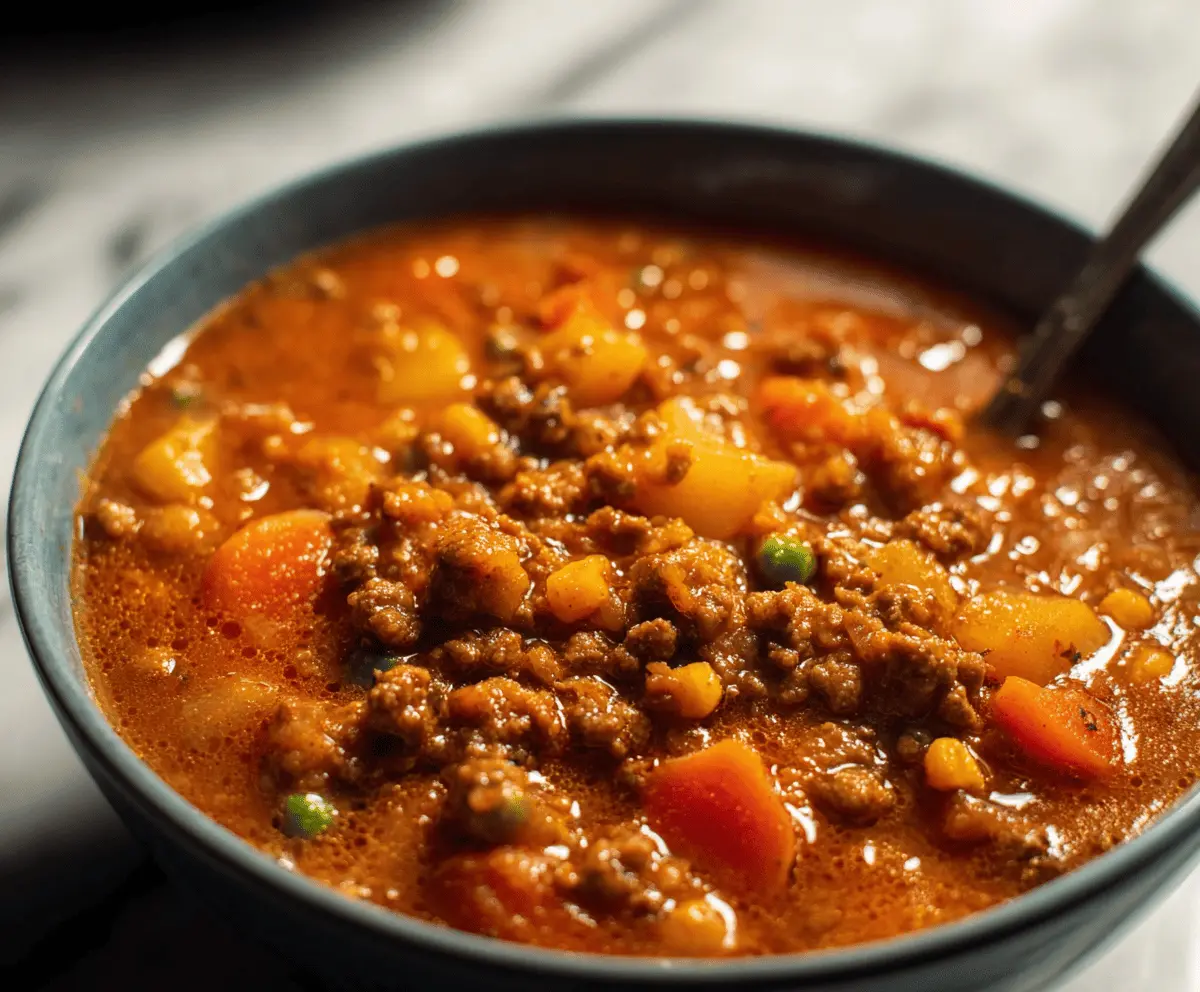 Hearty homemade Hamburger Stew with ground beef, vegetables, and flavorful broth in a rustic bowl.