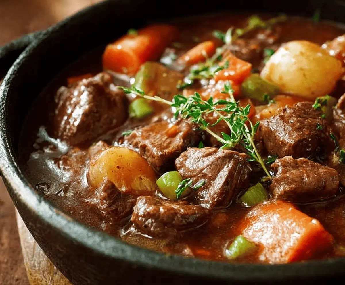 Remove the thyme sprigs and bay leaves. Taste the stew and add more salt or pepper if needed. Serve your Irish Stew hot, garnished with fresh thyme and optionally some chopped parsley. Enjoy it with crusty bread or mashed potatoes for a truly comforting meal!