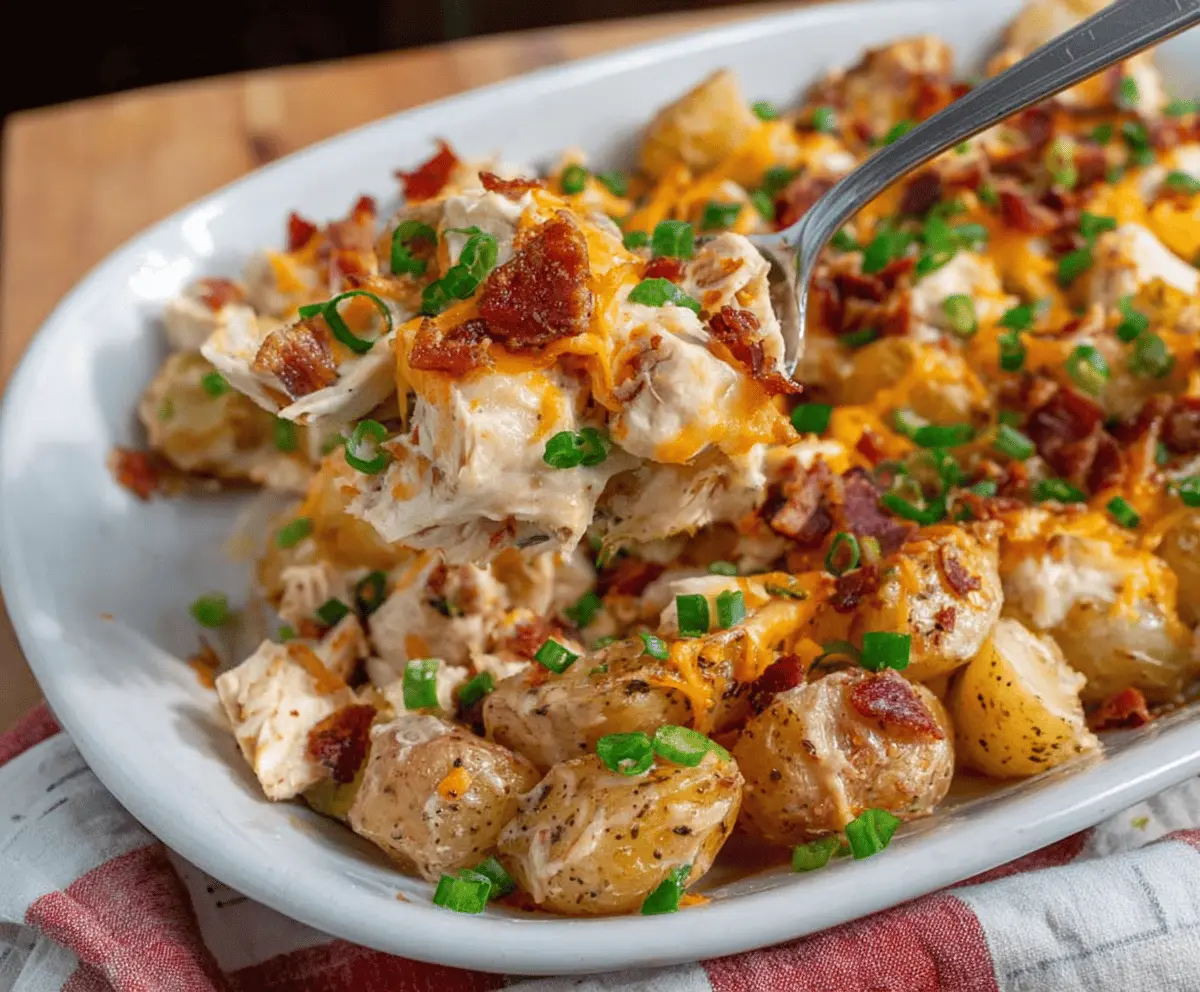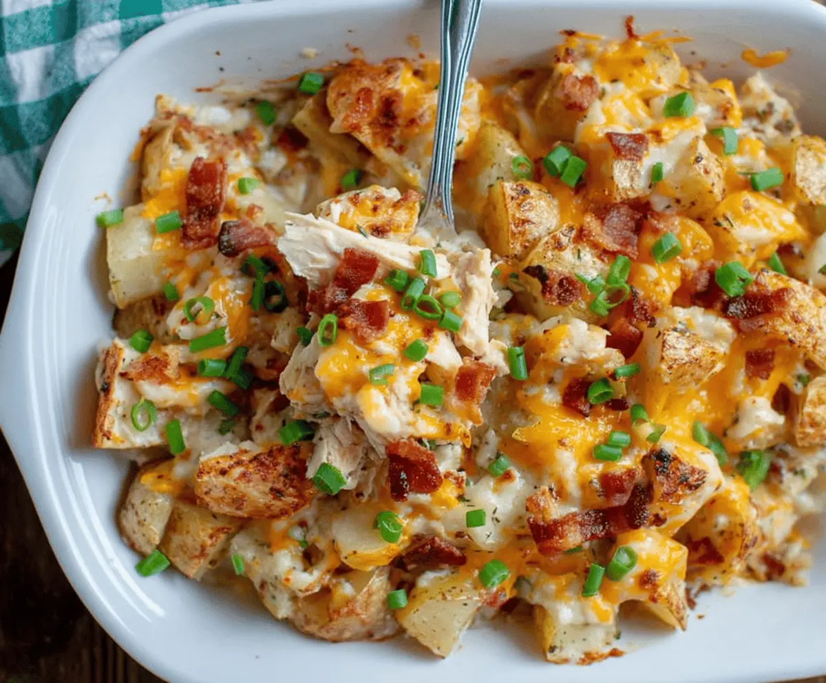 Once the potatoes are done, transfer them to a casserole dish. Add the chicken and ranch mixture on top of the potatoes and gently stir to combine everything evenly. Sprinkle the remaining cheddar cheese and crumbled bacon over the top. Bake the casserole, uncovered, for 15 to 20 minutes or until the cheese melts and turns bubbly.