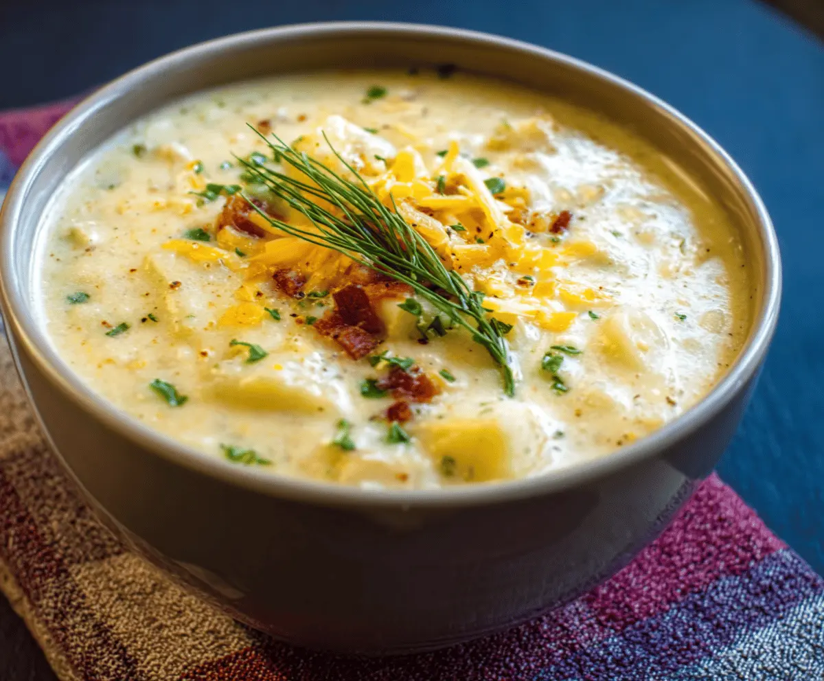 Season the soup with salt and pepper to your liking. Heat it gently, but avoid boiling so the dairy doesn’t curdle. Ladle the soup into bowls and top with crispy crumbled bacon, extra shredded cheddar, and chopped fresh chives.