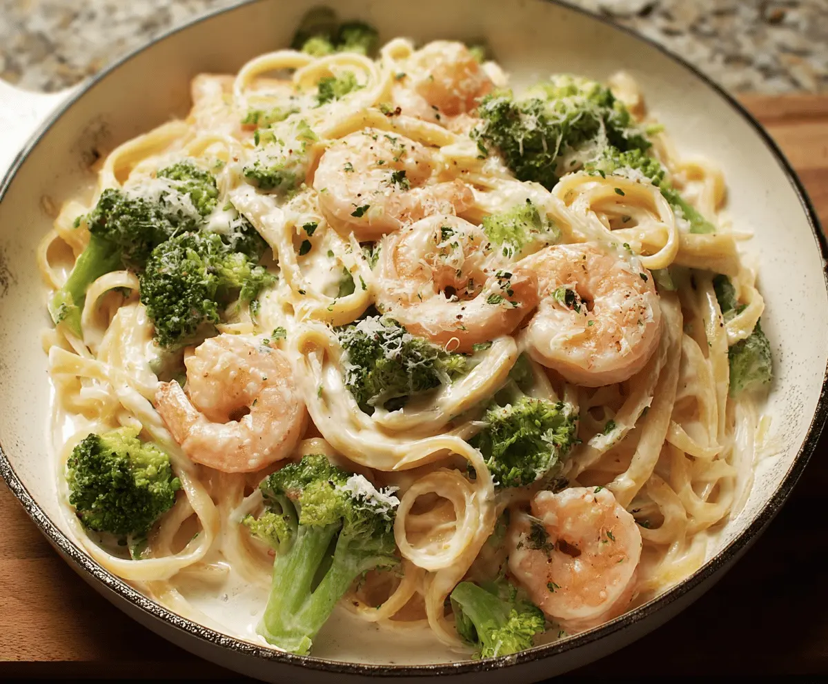 This dish usually takes about 25-30 minutes from start to finish. That includes boiling the pasta, steaming the broccoli, cooking the shrimp, and preparing the creamy Alfredo sauce. It’s a quick and satisfying meal perfect for busy weeknights!