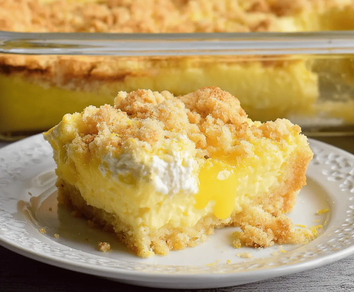 Remove the cake from the oven and let it cool completely at room temperature. Then chill it in the refrigerator for at least 2 hours to help the filling set perfectly. When ready, cut into squares and serve with a dollop of whipped cream and a sprinkle of extra lemon zest if you like a little extra zing.